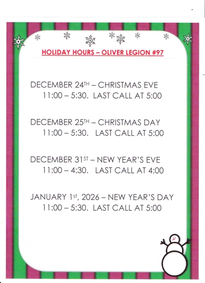 Oliver Legion meat draws every Saturday.
